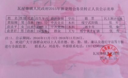 瓦屋塘镇2015年新录用公务员转正公示